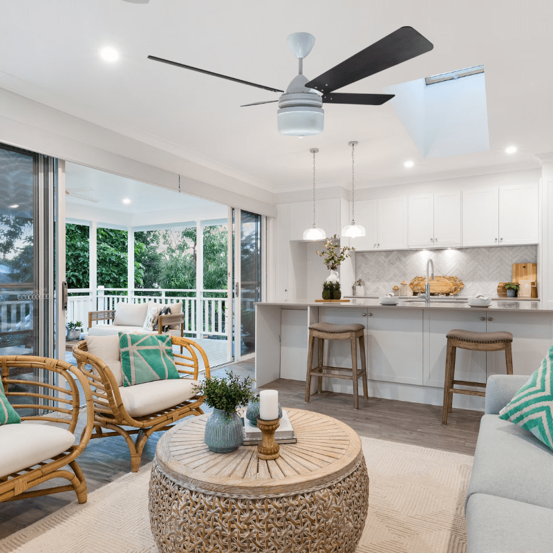 High Breeze Motor White Blades Wood 4 Black with Cleo Light Kit in 1200mm or 1400mm Sweep