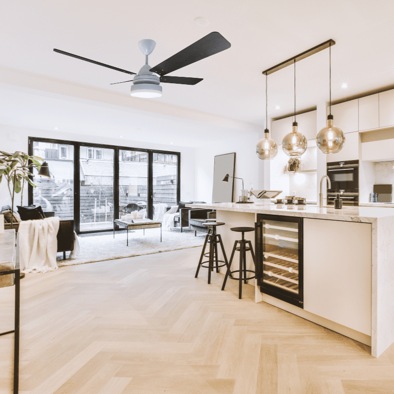 Fan supplied with 230mm downrod. Select longer or shorter down rods for higher or lower ceilings