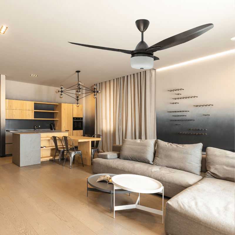 Fan supplied with 230mm downrod. Select longer or shorter down rods for higher or lower ceilings